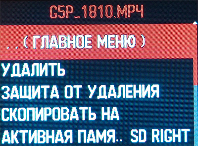 Во время просмотра при нажатии на кнопку "Меню" доступны следующие возможности: удалить файл, защитить от удаления, скопировать на другую карту памяти, запустить слайд-шоу. Копирование на другую карту памяти может пригодиться в ситуациях, когда запись обязательно нужно сохранить - для надежности.