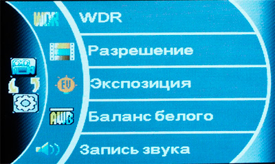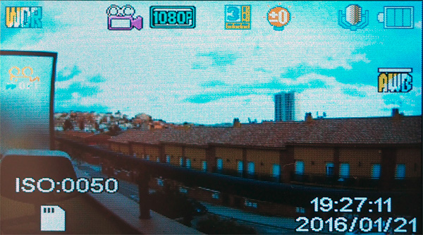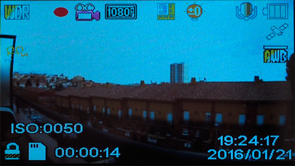 Во время работы видеорегистратора на дисплей выводится различная информация: включен ли режим WDR, вид съемки, разрешение, длительность ролика, компенсация экспозиции, баланс белого, работа микрофона, уровень заряда аккумулятора, статус GPS, ISO, дата/время.