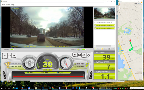 Если в процессе записи включен режим отслеживания координат, то после поездки вы можете получить подробную информацию о маршруте, скорости, пройденной дистанции и срабатывании G-сенсора - с помощью программного обеспечения DOD Player, которое надо инсталлировать с прилагаемого диска.