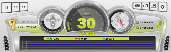 На "приборной доске" выводится подробная информация: максимальная скорость разгона до 100  км/ч (или до максимальной скорости движения), срабатывания G-сенсора, скорость движения, направление движения и текущие координаты.