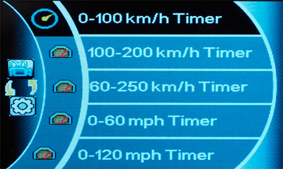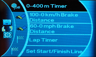 Следующие режимы замеров: время прохождения 400 метров, время торможения со 100 км/ч до нуля, время торможения с 60 миль/ч до нуля, время прохождения круга, установка линии старта/финиша.
