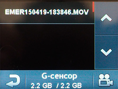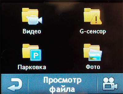 Окно просмотра файла: видео, фото, видео по срабатыванию G-сенсора, видео, снятое в режиме "Парковка" (движение в поле зрения видеорегистратора).