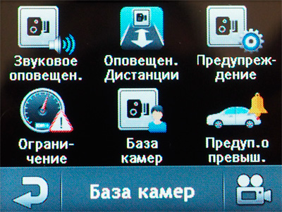 Меню базы камер. Саму базу камер нужно скачивать с сайта Mio, там же содержится информация о том, каким образом производится обновление (скачанный файл нужно просто поместить в корень SD-карты, после чего включить видеорегистратор - он сам произведет обновление).