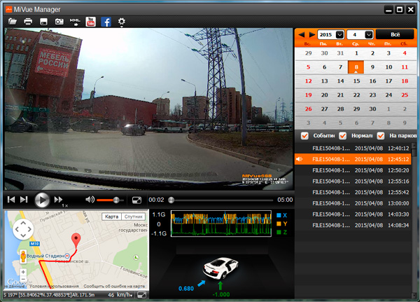 В программе ведется календарь, с помощью которого очень удобно выбирать для просмотра конкретный день. В плеере можно воспроизвести ролик, при этом в случае записи GPS-координат вам на карте покажут трек перемещений, также на втором дополнительном окне будет показана диаграмма срабатываний G-сенсора (это может пригодиться для "разбора полетов" в случае, не дай бог, каких-то инцидентов).