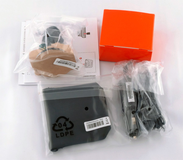 Внутри: видеорегистратор, крепление для стекла, автомобильный адаптер питания с длинным проводом, брошюрки, чехол, диск с ПО.