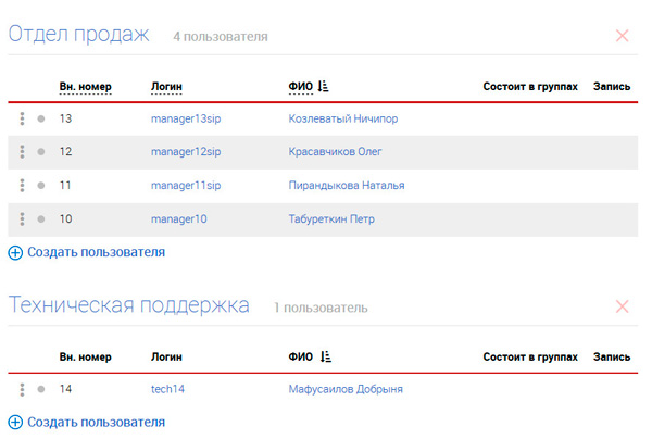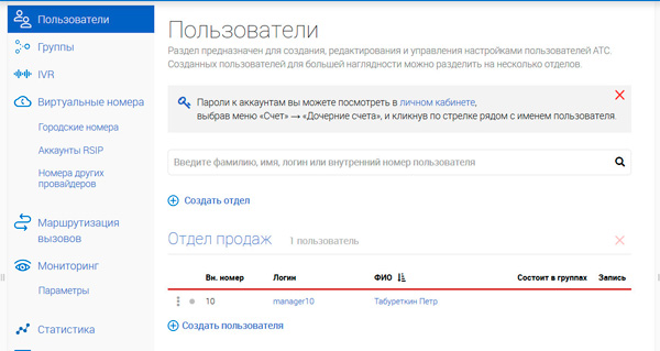 У вас есть отдел и пользователь. Теперь можно заняться дальнейшей настройкой вашей АТС.