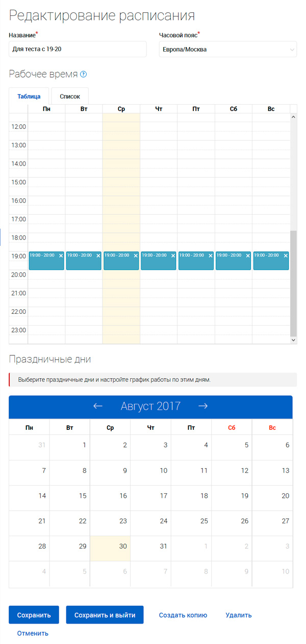 Также здесь задается расписание, по которому работает группа, и эти расписания - очень и очень гибкие: часовые пояса, временные промежутки по дням недели, праздничные дни и так далее.