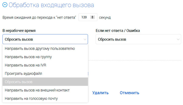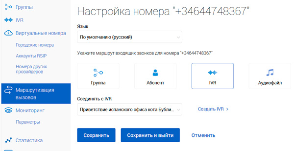 Настраиваем подключенный городской номер. Как видите, его можно маршрутизировать на соответствующую группу (например, "Отдел продаж"), на конкретного пользователя, голосовое меню или на проигрывание аудиофайла.