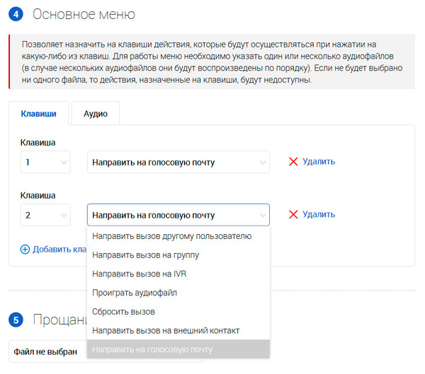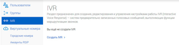 Теперь очень интересный раздел - IVR (Interface Voice Responce). Это создание и настройка голосовых сообщений, выполняющих функции маршрутизации входящих звонков.