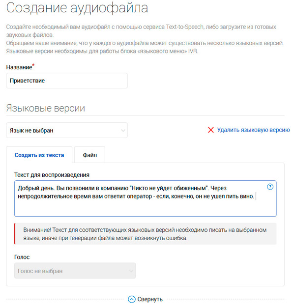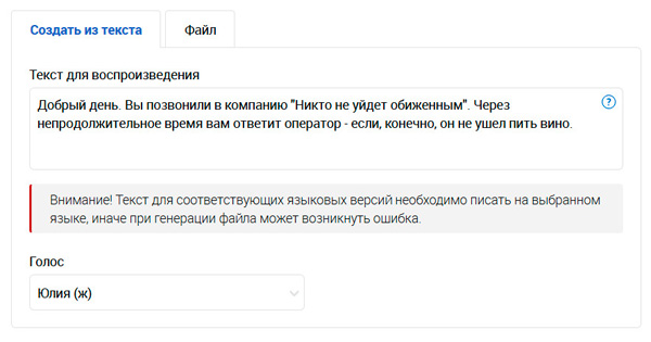 Автоматическое сообщение может быть создано из файла, но его также можно создать из набранного текста, для которого доступны несколько видов голосов.