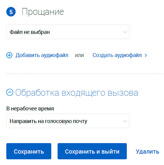 Завершение работы пользователя с голосовым меню, обработка звонков, сделанных во внерабочее время.