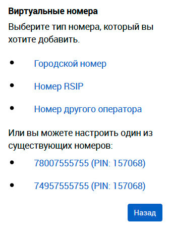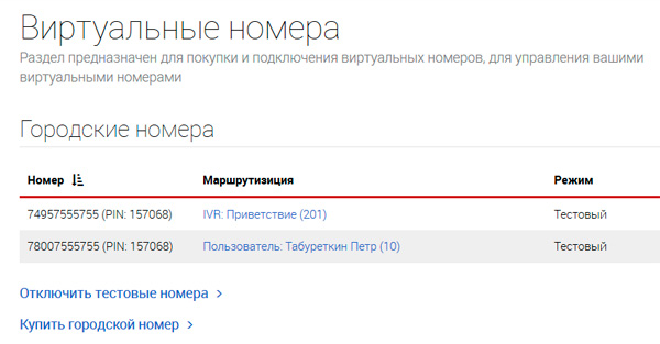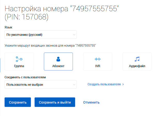 Пользователя сразу можно подключить к какому-то номеру. Вы можете использовать два бесплатных городских номера, для звонков на которые нужно будет указывать ваш пин.