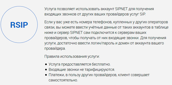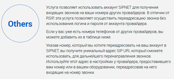 Вы также можете сюда подключать номера телефонов, купленных у других операторов связи SIP.