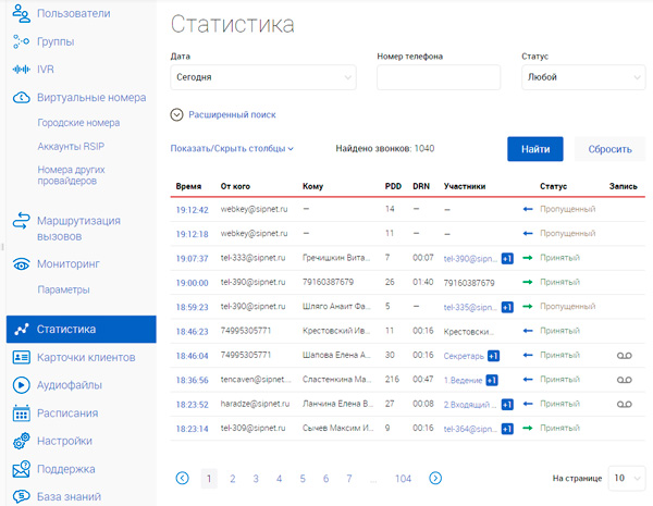 Раздел "Статистика" - подробная статистика по звонкам с отбором по фильтрам, статусами и возможностью прослушать записанный разговор.
