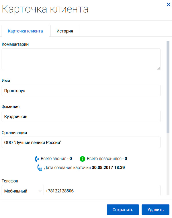 Раздел "Карточки клиентов". При первом звонке создается карточка клиента, которая будет доступна всем операторам, туда записывается всевозможная информация о клиенте.