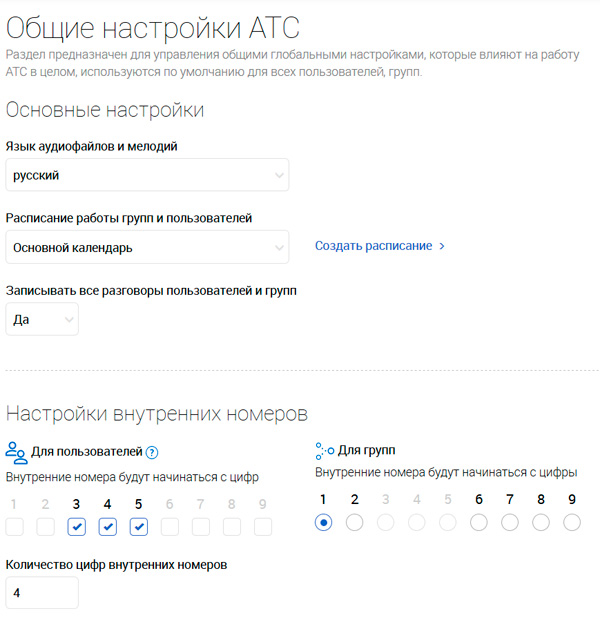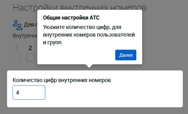 При первом входе в раздел администратора запускается мастер, который поможет вам в первичной настройке АТС: нужно будет задать количество цифр для внутренних номеров пользователей и групп, три начальные цифры внутренних номеров пользователей, цифру внутренних номеров групп.