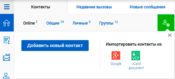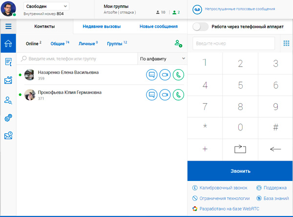 Как видите, тут все просто и наглядно: контакты, недавние вызовы, новые сообщения, телефонный набор, пользователи на линии, общие, личные, группы.