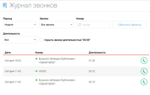 Ведется подробный журнал звонков.
