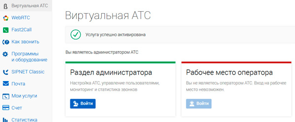 Главная страница виртуальной АТС