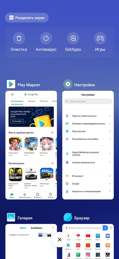 В списке запущенных приложений теперь сверху есть возможность разделить экран, идут пиктограммы очистки и так далее, а сами приложения показаны в два ряда и скроллируются по вертикали.