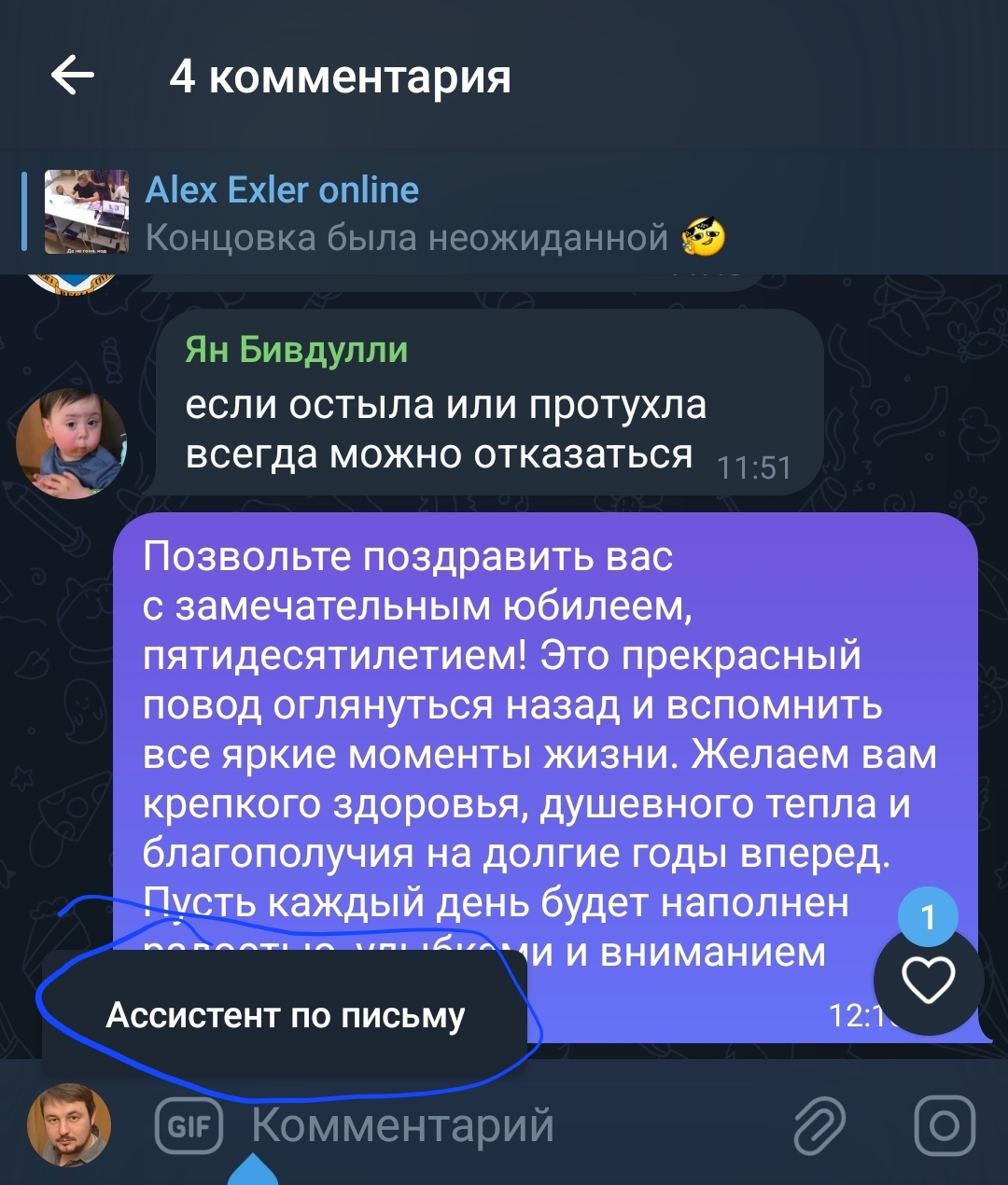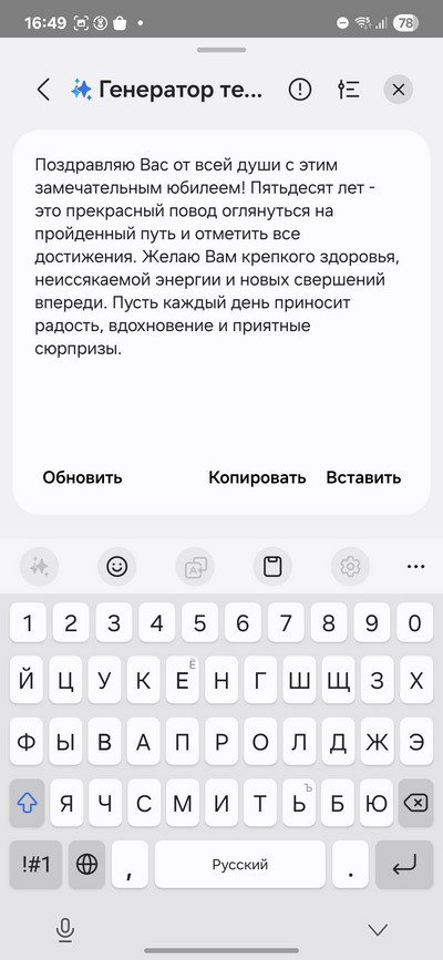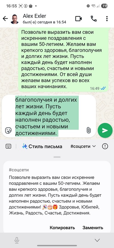 Вот, например, я попросил генератор текста составить поздравление с 50-летием в торжественной манере. После этого его можно вставить в чат, при необходимости отредактировать и отправить. Также можно попросить изменить стиль поздравления на, например, сетевой (скриншот справа).
