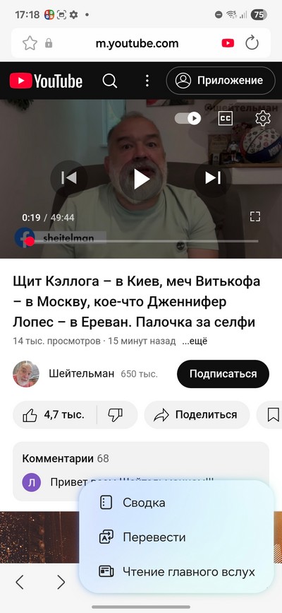 Также если в браузере открыть ролик YouTube, то и там можно получить краткую сводку, перевод текста к ролику, чтение главного вслух (это просто сводка зачитывается голосом).