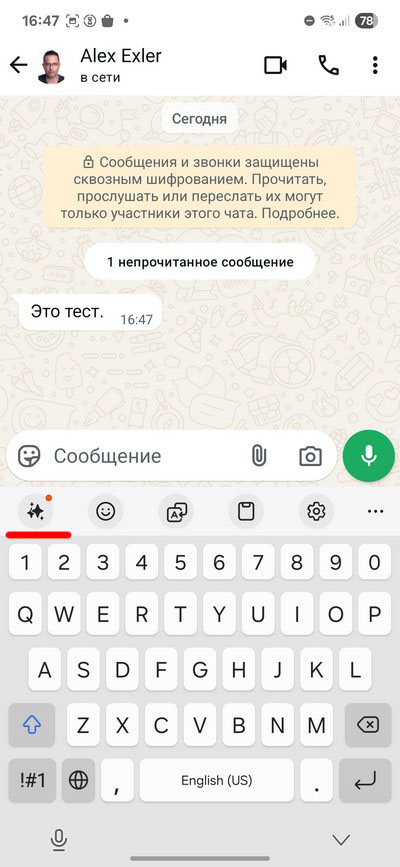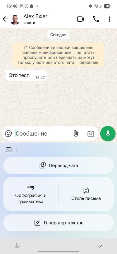 При вызове клавиатуры Samsung в мессенджерах (и не только в них) там появляется значок Galaxy AI. При его нажатии предлагаются следующие варианты (для мессенджеров): перевод чата на выбранный язык, проверка орфографии и грамматики, изменение стиля письма, генератор текстов по вашему заданию.