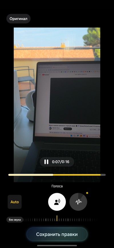 Я для примера записал видеоролик с голосом на фоне шума турбины самолета (ролик из YouTube), также с улицы были слышны громкие звуки, издаваемые цикадами.
