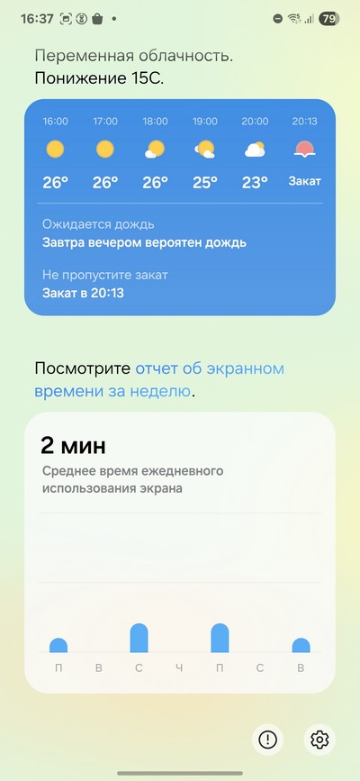 Это персонализированная страница с информацией, которая вам может пригодиться. Ссылка на нее выводится снизу страницы блокировки, и вы можете настроить переход на эту страницу без разблокировки смартфона. Там выдается прогноз погоды, информация об использовании смартфона (2 минуты использования экрана - это потому что я открыл данную страницу сразу после инициализации смартфона), информация о качестве сна, о событиях в календаре, о вашей активности и тренировках, также на этой странице показывается коллаж из фото, сделанных за день.