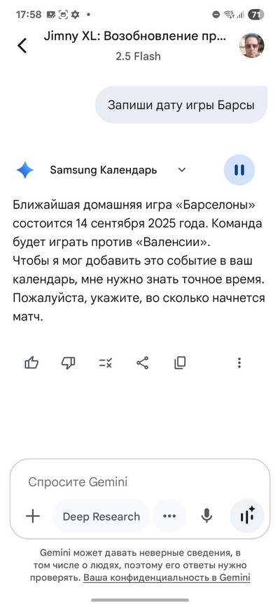 Вот, например, я его попросил выяснить, когда будет ближайшая игра "Барсы" на их домашнем стадионе и попросил создать напоминание об этом в календаре.