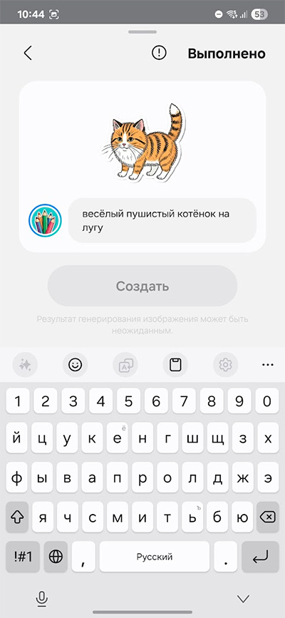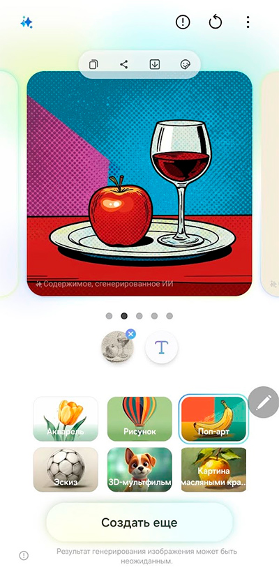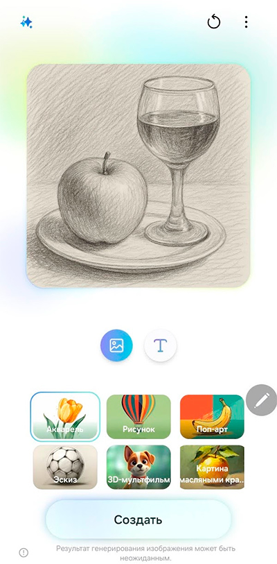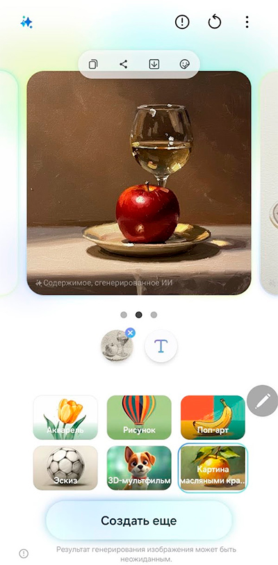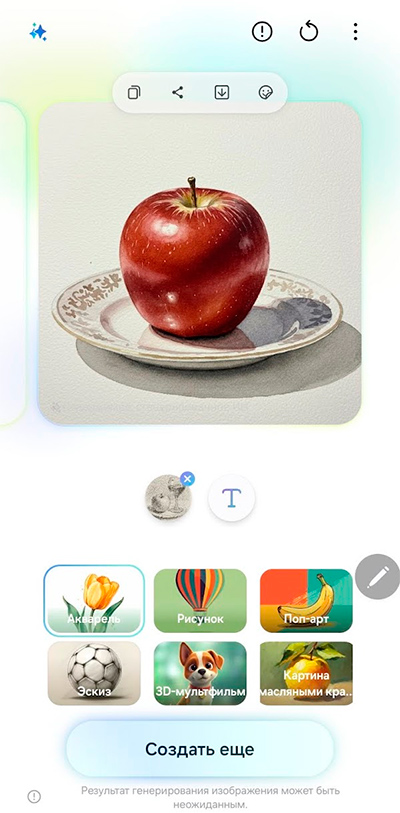 В разделе стикеров можно нажать значок Galaxy AI и создать свой собственный стикер по описанию. Не на все элементы описания он реагирует, но, в общем и целом, получается неплохо.