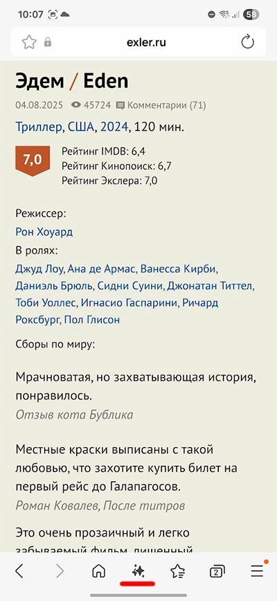 Кстати, замечу, что по умолчанию нижнее меню браузера Samsung со значком Galaxy AI появляется только при открытии страницы, а при скроллинге оно исчезает. Вернуть его можно только если снова переместиться к началу странице. Ну и в настройках вы можете закрепить это меню, чтобы оно не скрывалось.