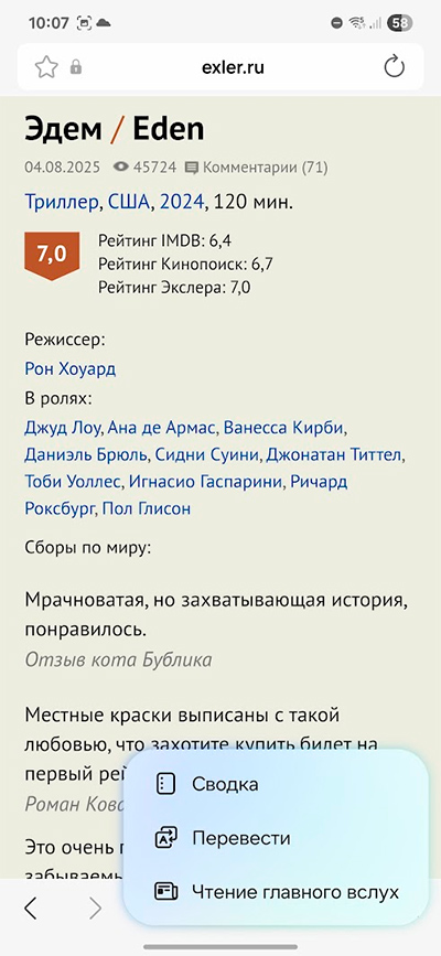 Открываете какую-то статью (я для примера открыл свою рецензию), там в нижней панели выбираете значок Galaxy AI: там появится меню "Сводка", "Перевести", "Чтение главного вслух".