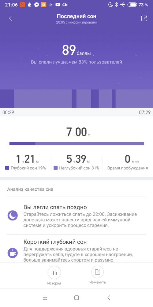 Главное окно: количество шагов, километры, килокалории, сон, пульс.