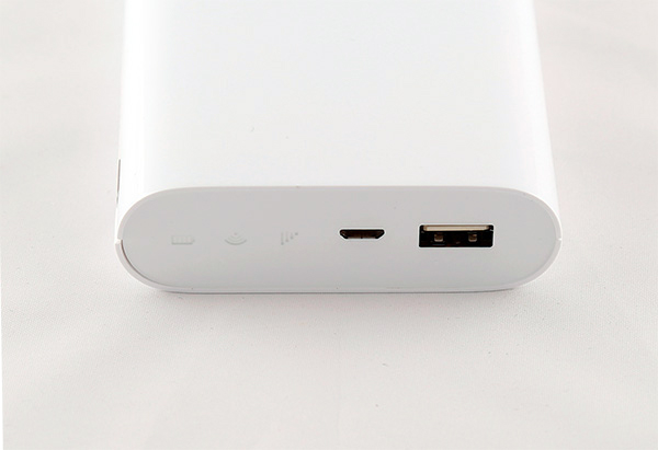 В передней части устройства расположены порты USB и microUSB, а также светодиоды: питание, сеть Wi-Fi, уровень сигнала. Слева сбоку расположена кнопка включения/выключения питания.
