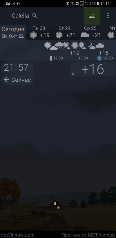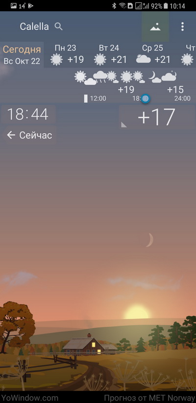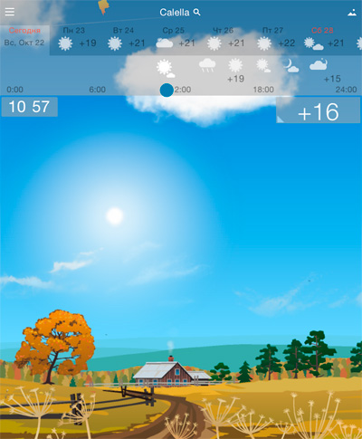 Причем, что интересно, одна из любопытных фишек данного приложения: сверху, где идет часовая шкала, вы можете перемещать ползунок и в процессе перемещения пейзаж будет меняться, очень наглядно показывая, что же там дальше будет. Забавно придумано, я такого, по-моему, еще не встречал. Картинка текущей погоды и времени - да, это давно было, а вот что можно скроллировать по часам вместе с изменением картинки - такого не припомню.