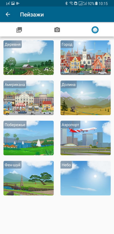 Пиктограмма справа сверху - пейзажи. Там есть стандартный набор различных местоположений (у них еще динамически меняется время дня).