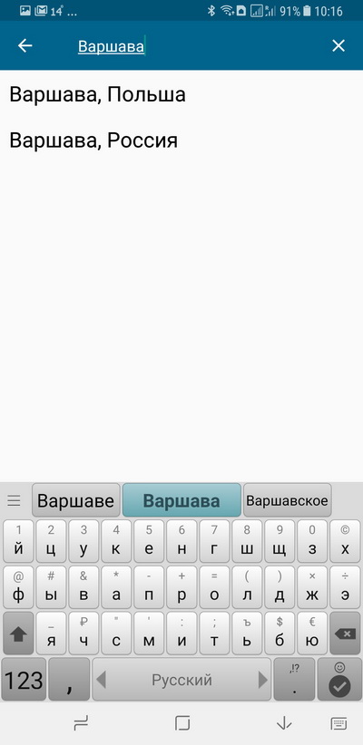 Ну и найденный город добавляется в список истории поиска. С помощью менюшки город из списка можно удалить, назначить домашним или настроить его свойства.