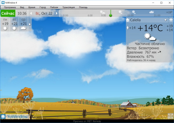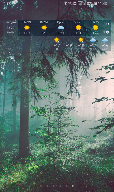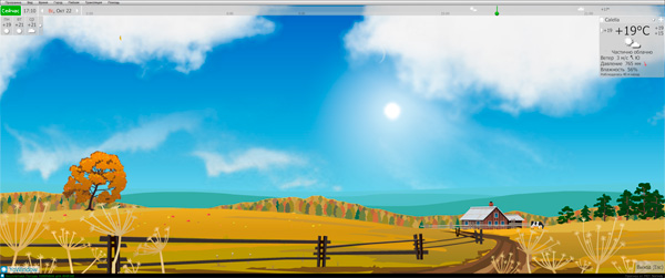 Пейзажи на экране меняются в зависимости от текущей погоды, вашего местоположения и времени суток.