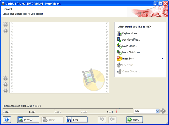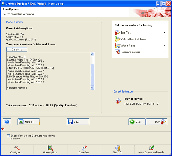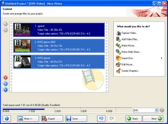 По умолчанию в Video Options (кнопка снизу) выставлено качество Fit to Disk - это означает, что сначала Nero Express выставляет максимальное качество, а по мере заполнения проекта роликами, если суммарный размер фильмов превышает размер болванки, программа постепенно будет уменьшать качество до какого-то определенного предела (от 8000 кбит/с до минимальных 2537 кбит/с). Однако следует иметь в виду, что без явной необходимости ролики при записи на DVD лучше не сжимать. Болванки стоят недорого, поэтому лучше не жадничать и писать один полуторачасовой фильм на одну болванку. Если речь идет о сериалах, то разумное количество часов на одну болванку - три часа, то есть три часовых серии, не больше. Дальнейшее сжатие чревато заметной потерей качества.