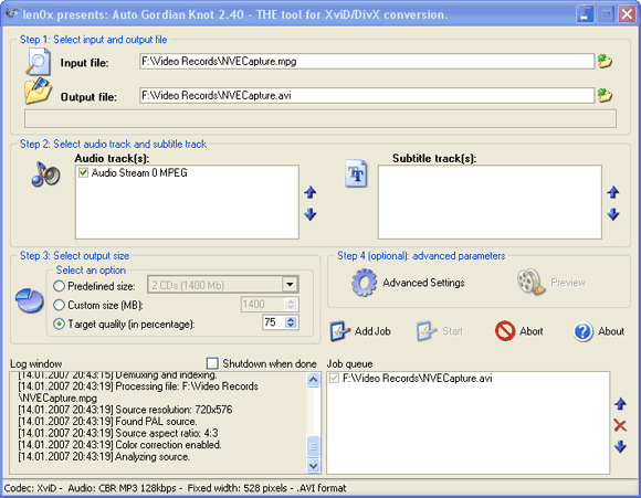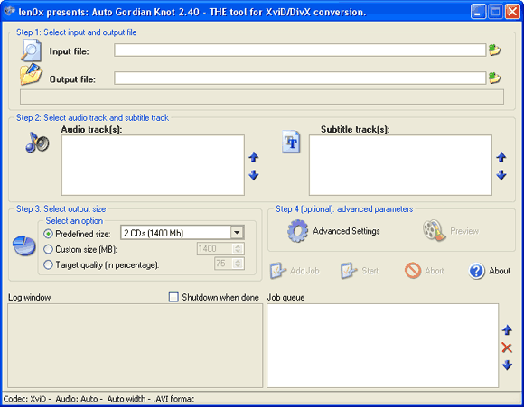 Одна из наиболее удобных, на мой взгляд, программ для перегонки MPEG-2 в MPEG-4 - это Auto Gordian Knot (скачать): бесплатная надстройка над Virtual Dub Mod (Virtual Dub Mod входит в комплект поставки), позволяющая легко и быстро задать нужные параметры перекодирования, не ломая себе голову над тонкостями.