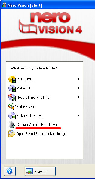 Один из пунктов стартового меню Nero Vision предлагает Capture Video to Hard Drive - это именно то, что нужно.