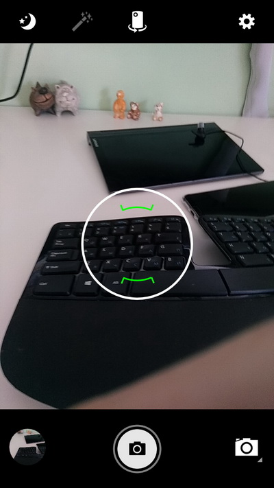 Интерфейс совершенно аскетичный. Сверху можно выбрать режим, фильтр обработки, сменить камеру, зайти в настройки. По центру идет фокусировочное кольцо, которое срабатывает автоматически, наводя на резкость.