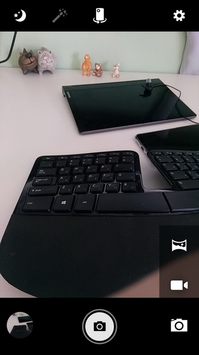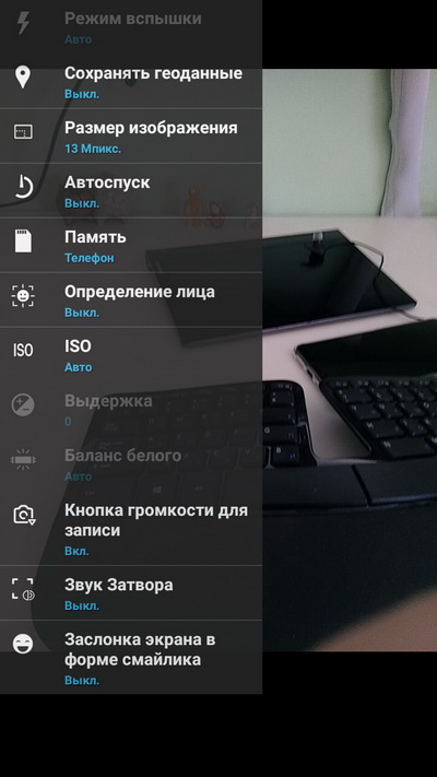 Внизу - переход в галерею, кнопка съемки, меню выбора: фото, видео, панорама.