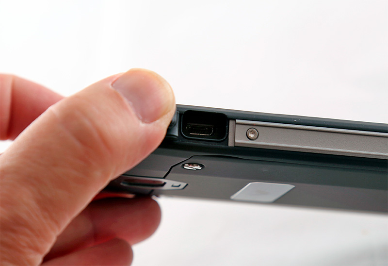 А вот заглушка порта microUSB на левом торце открывается с заметным усилием, и я побоялся открывать ее ногтем. Нет, конечно, для какого-нибудь охотника-рыболова, который ногтем может распороть брюхо форели или перерезать горло перепелке, это проблем не создаст. Но я на всякий случай пользовался отверткой или кончиком ножа.