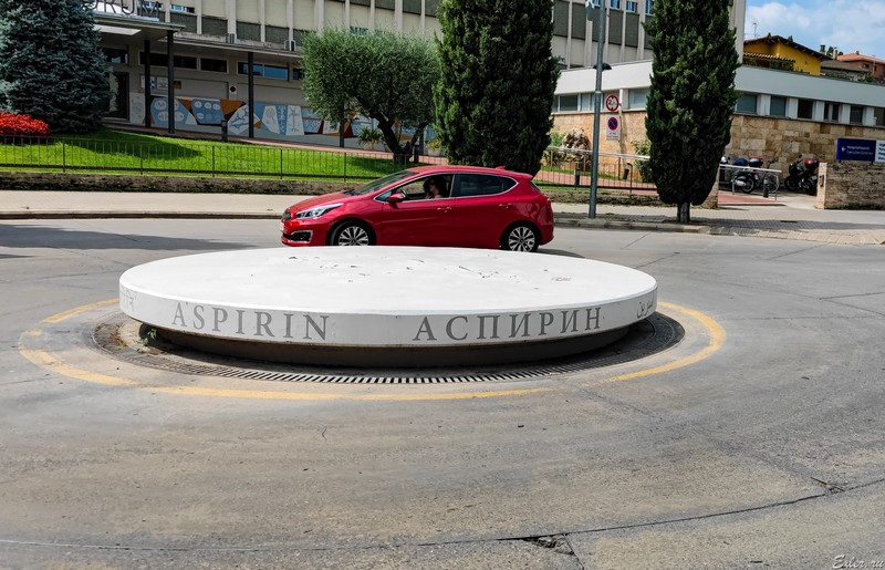 Памятник аспирину рядом с местным госпиталем. (И даже есть надпись на русском.) Интересно, за что ему такая честь?