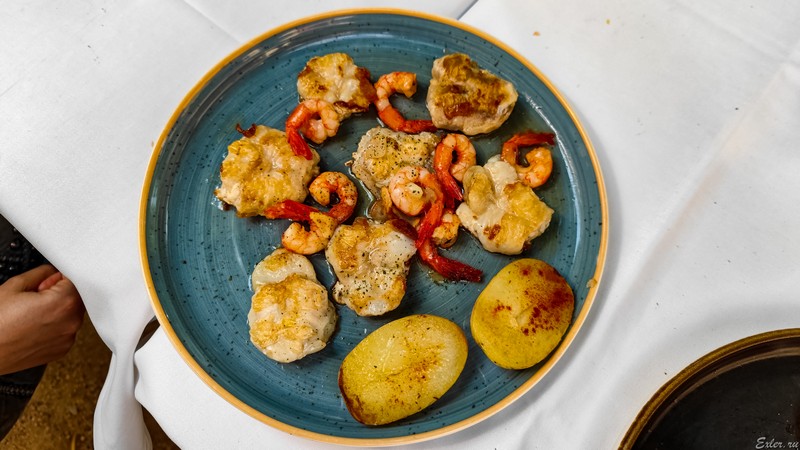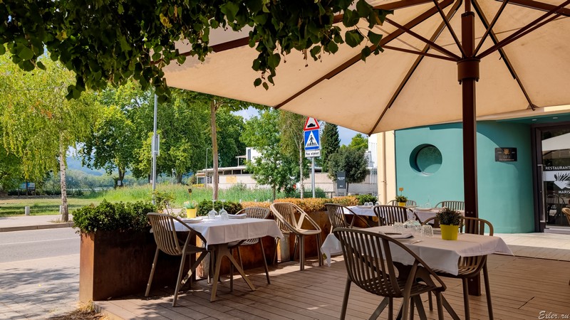 В итоге выбрали ресторан морепродуктов Marisqueria Gils. Он расположен не на берегу озера, но совсем недалеко от него. У ресторана есть летняя площадка, где мы и расположились. (Разумеется, столик заранее бронировали: в хороший ресторан в выходной без брони попасть - нереально, все забито.)