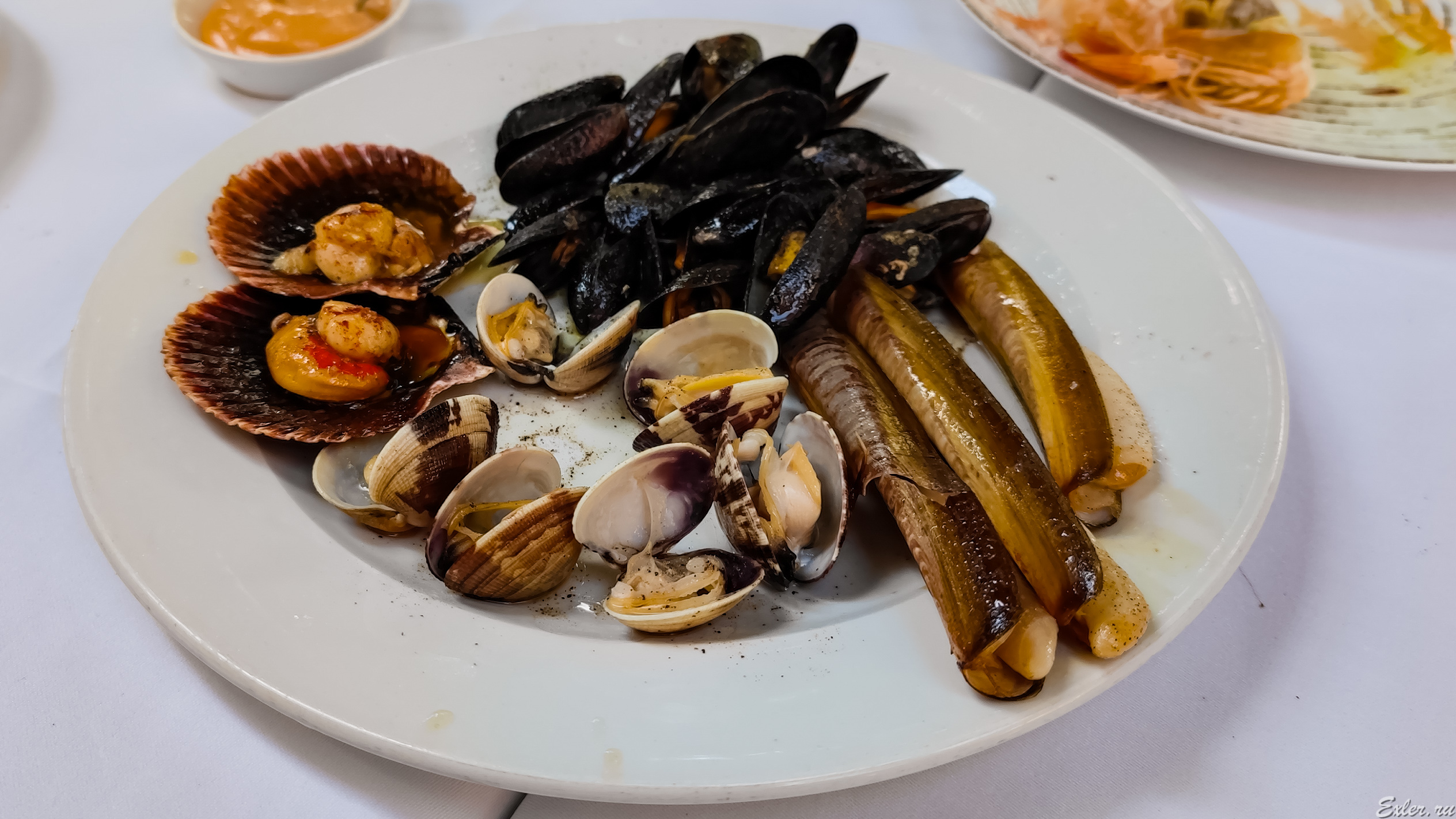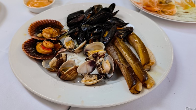 И вот когда ее принесли - стало все понятно: тут гребешки, моллюски, мидии и навахос (длинные морские моллюски), которые я очень люблю. Я, впрочем, все морепродукты очень люблю. И заметьте, что это все - блюдо для одного человека (только второго гребешка они нам добавили, когда узнали, что мы это берем на двоих).