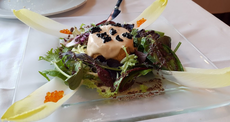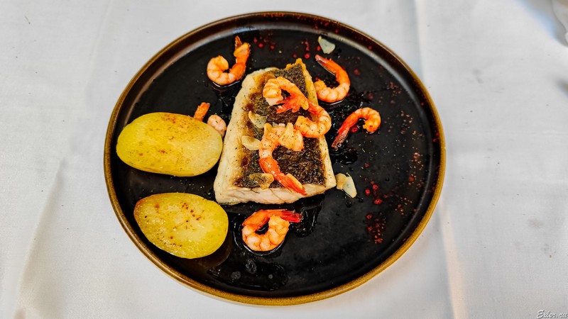 У жены было еще более интересное блюдо, которое я, конечно, попробовал - оно называется "щечки трески". В описании говорилось, что для этого блюда берутся специальные части трески, расположенные в голове: эти кусочки богаты желатином и считаются деликатесными. И правда - настоящий деликатес: очень нежное и вкусное блюдо.