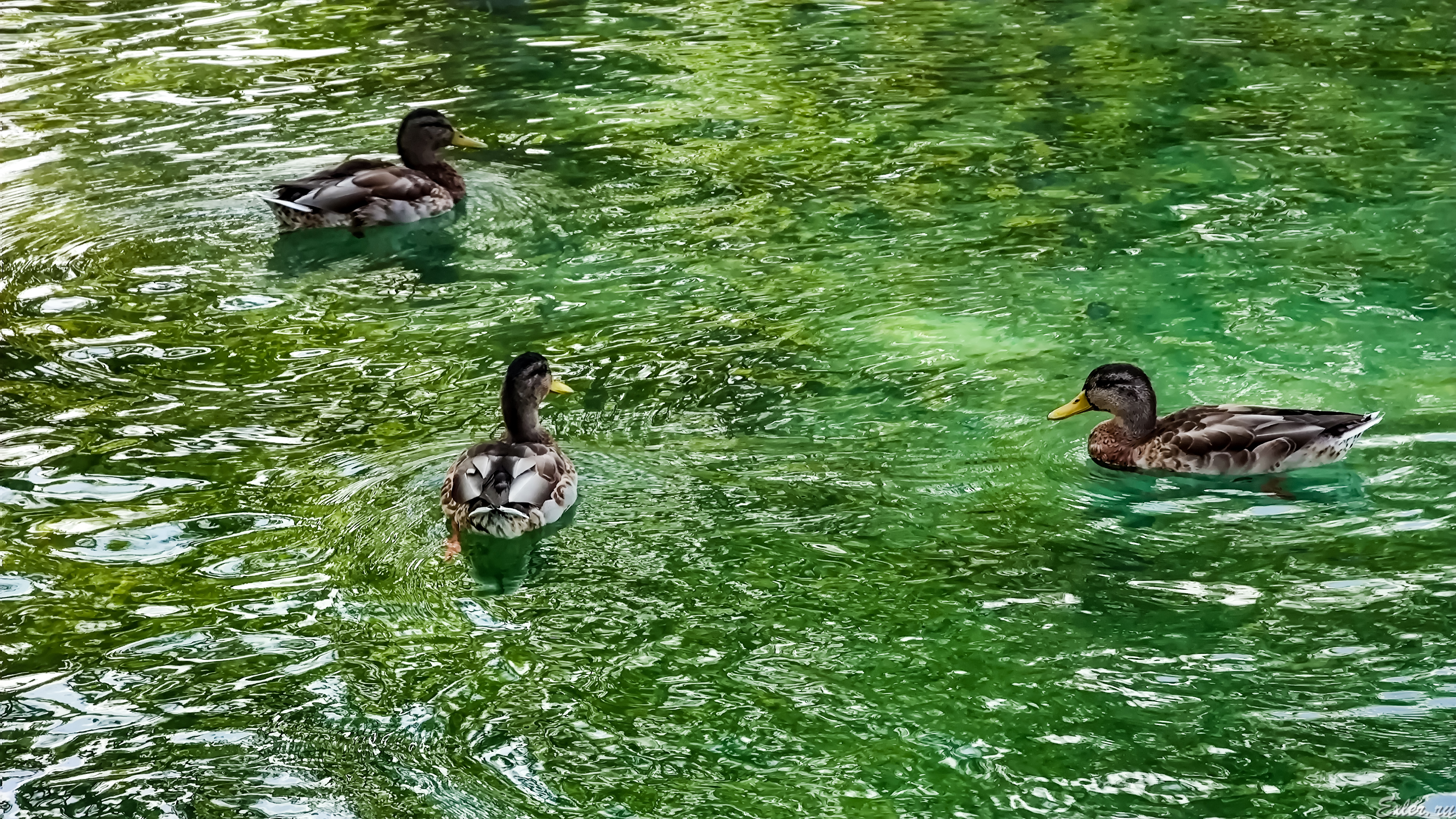 У берега плавают утки и селезни. Вроде как их запрещено кормить, но все равно кормят хлебом и чипсами.